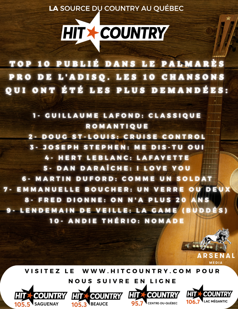 Salut voici le top 10 PALMARES PRO de l’ADISQ Hit Country!