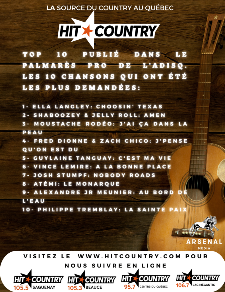 TOP 10 publié dans le Palmarès Pro de l’Adisq. Les 10 chansons qui ont été les plus demandées: